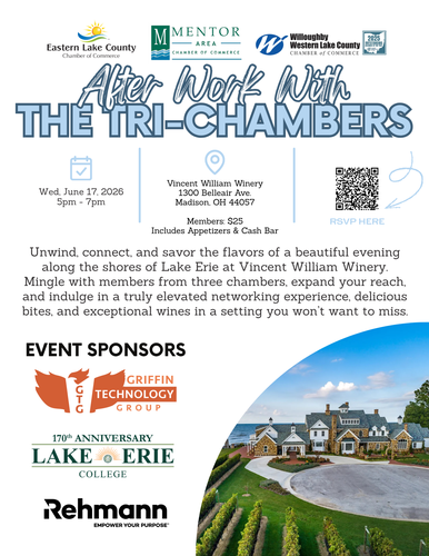 Unwind, connect, and savor the flavors of a beautiful evening along the shores of Lake Erie at Vincent William Winery. Mingle with members from three chambers, expand your reach, and indulge in a truly elevated networking experience, delicious bites, and exceptional wines in a setting you won't want to miss.